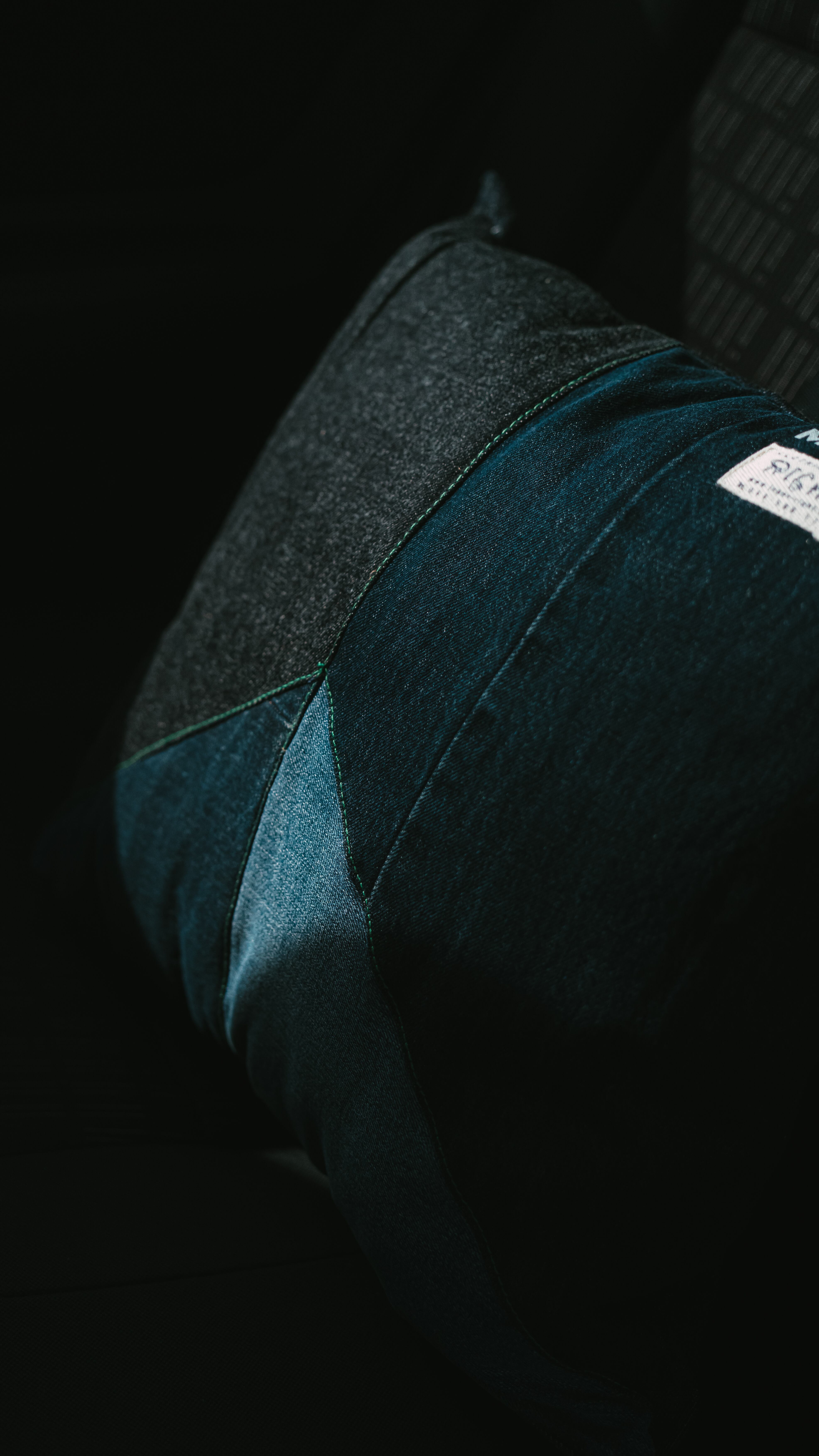 ライムグリーン色のステッチで”PEACE”マークをデザインモチーフとし縫合しました。